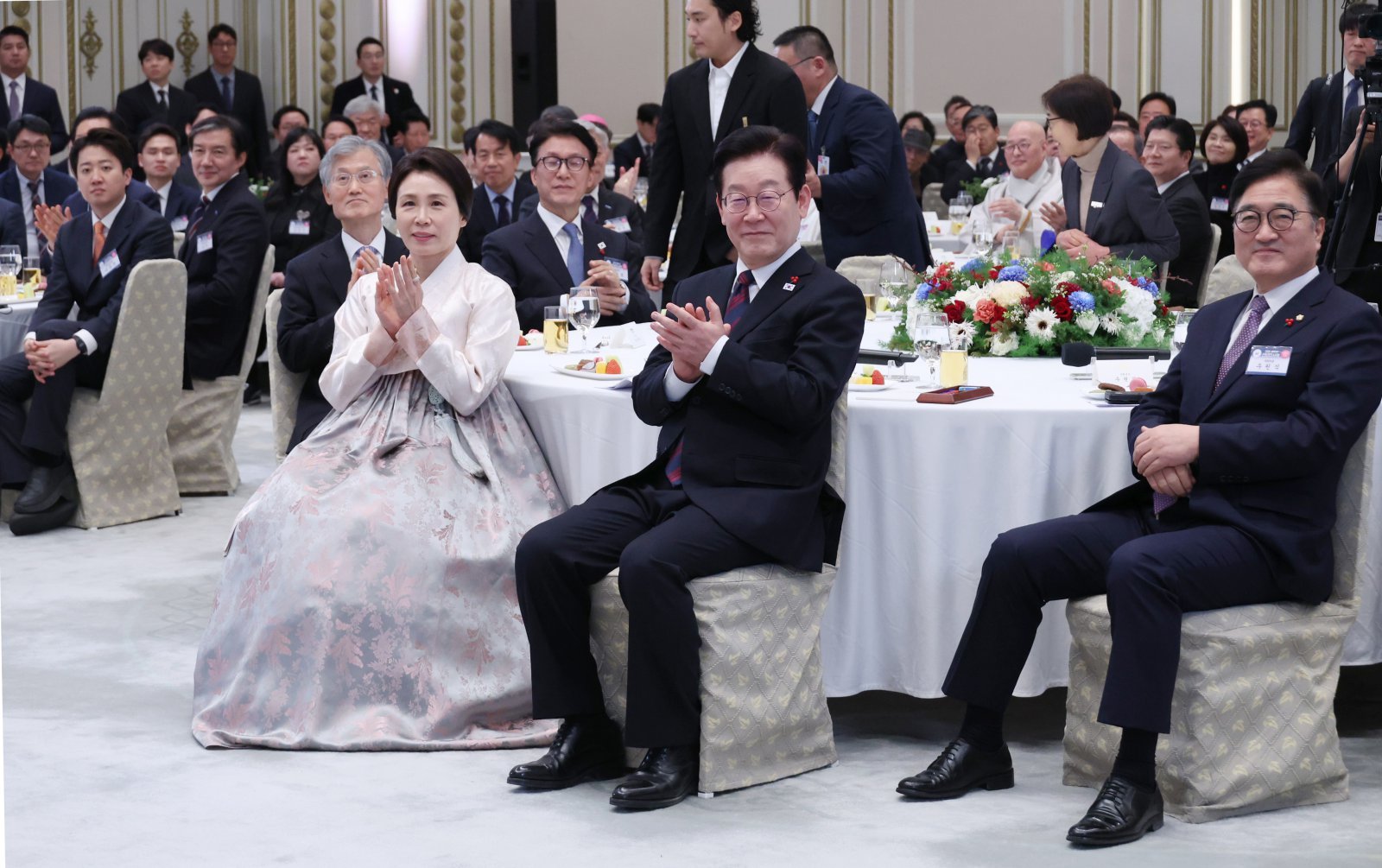 이재명 대통령과 김혜경 여사, 5부 요인이 2일 청와대 영빈관에서 열린 신년 인사회에서 박수를 치고 있다. 오른쪽부터 우원식 국회의장, 이 대통령, 김민석 국무총리, 김 여사, 조희대 대법원장. 이날 국민의힘 지도부는 신년 인사회에 불참했다. 뉴시스