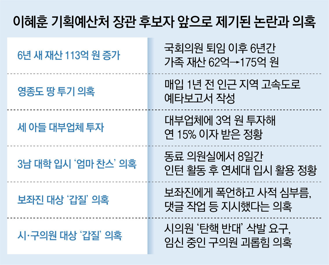 이혜훈 기획예산처 장관 후보자가 5일 170억 원이 넘는 재산을 신고했다. 2020년 총선 낙선으로 4선에 실패하며 국회의원직을 퇴직할 때보다 재산이 약 113억 원이나 증가한 것. 지명 직후 ‘보좌진 갑질’ 논란으로 고개를 숙였던 이 후보자는 인사청문회를 앞두고 부동산 투기 의혹과 아들 대학 입시 ‘엄마 찬스’ 의혹 등 추가 논란이 이어지고 있다. 국민의힘은 “탈탈 털리기 전에 사퇴하라”며 총공세를 펼쳤다.