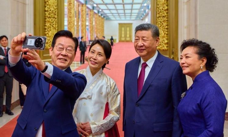 이 대통령은 5일 소셜미디어 X(옛 트위터)에 김 여사, 시 주석, 펑리위안(彭麗媛) 여사와 촬영한 사진을 올렸다. 사진에서 이 대통령은 직접 샤오미 15 울트라를 들고 시 주석 등과 사진을 찍었다.