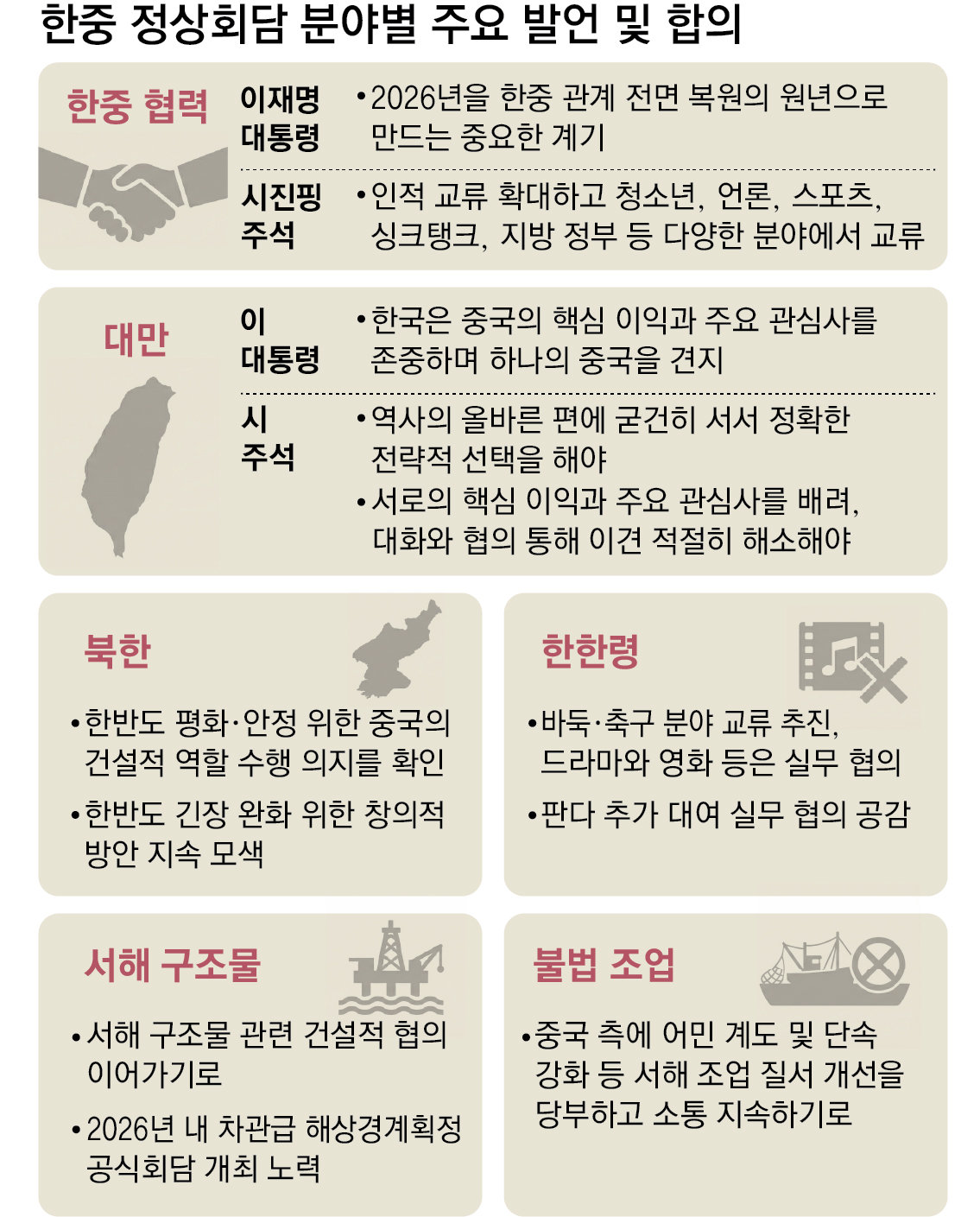 시진핑(習近平) 중국 국가주석은 5일 베이징 인민대회당에서 열린 이재명 대통령과의 정상회담 모두발언에서 이같이 말했다. 지난해 11월 경주 아시아태평양경제협력체(APEC) 계기로 열린 첫 정상회담 이후 두 달 사이 중국이 ‘핵심 이익’으로 여기는 대만 문제로 갈등이 고조된 일본을 겨냥하면서 사실상 중국 편에 서 달라는 메시지를 보낸 것으로 풀이된다. 예정 시간보다 30분 길어진 90분간 진행된 이날 회담에서 중국의 핵심 이익인 대만과 한국의 핵심 이익인 북한 문제에 대해 서로의 원칙을 확인한 가운데 두 정상은 한중 관계 복원에 속도를 내기로 했다. 청와대는 “한중 관계 전면 복원에 걸맞게 매년 만남을 이어가자는 공감대를 형성했다”고 밝혔다.