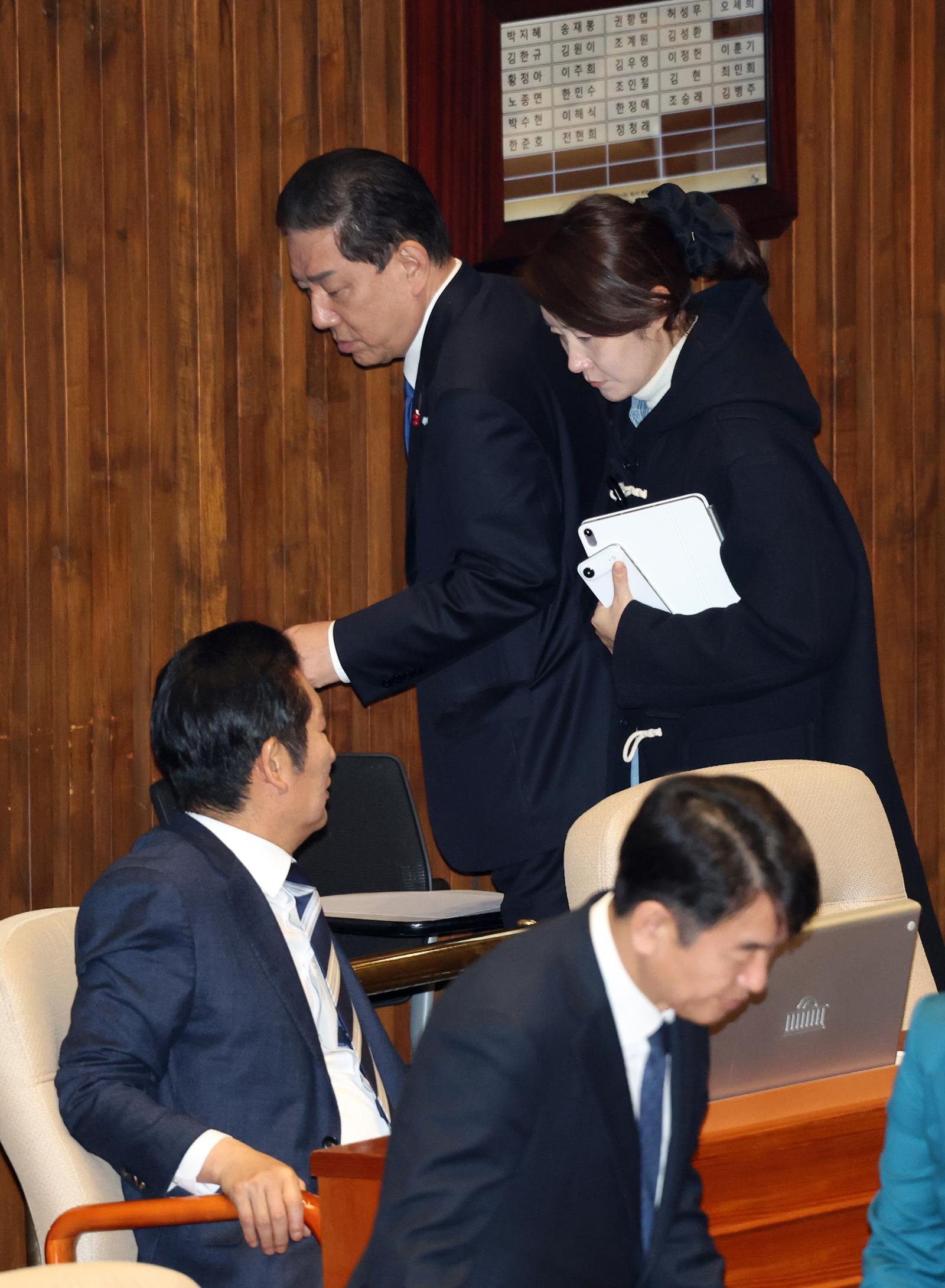 서울 여의도 국회에서 열린 제430회국회(임시회) 제2차 본회의에서 김병기 전 더불어민주당 원내대표와 강선우 의원이 대화를 나누며 발걸음을 옮기고 있다. 왼쪽 아래는 정청래 대표. 2025.12.31/뉴스1