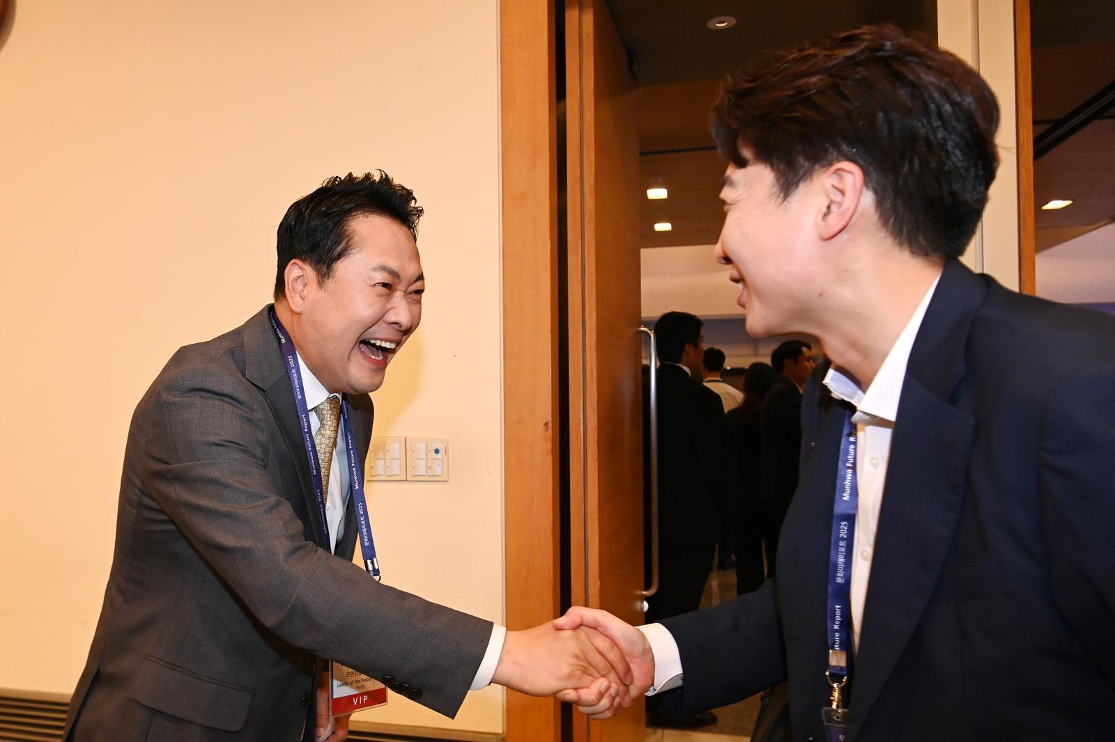 지난해 8월 26일 서울 중구 대한상공회의소에서 열린 ‘문화미래리포트(MFR) 2025 트러피즘 향방과 대한민국의 선택’ 국제 포럼에서 국민의힘 장동혁(왼쪽) 대표와 개혁신당 이준석 대표가 인사를 나누고 있다. 2025.8.26 국회사진기자단