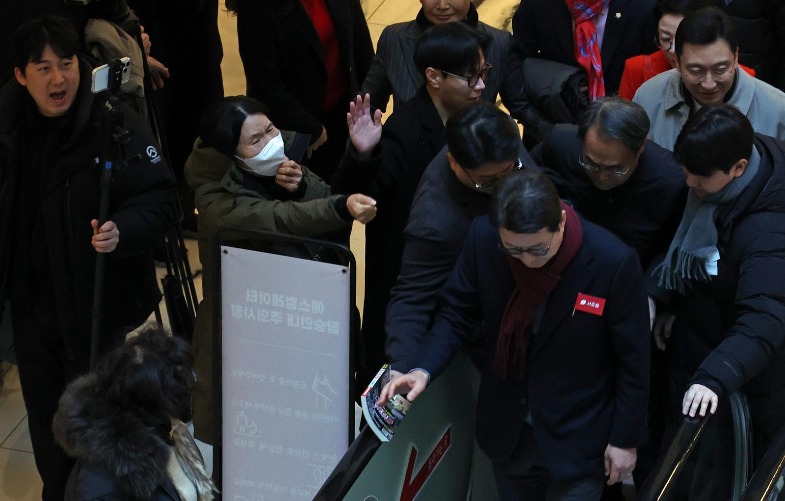 국민의힘 한동훈 전 대표의 지지자들이 14일 오전 국민의힘 서울시당 신년인사회가 열린 서울 영등포구 중소기업중앙회에서 신동욱 최고위원(오른쪽 아래)에게 항의하고 있다. 당 중앙윤리위원회는 이날 새벽 ‘당원게시판 사건’과 관련해 한 전 대표에 대한 제명 처분을 의결했다. 뉴시스
