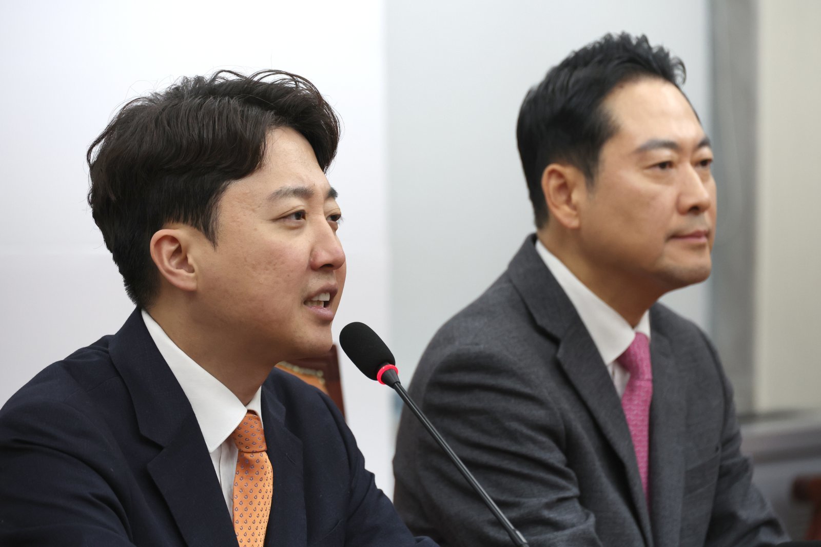 이준석 개혁신당 대표가 13일 오전 서울 여의도 국회에서 열린 장동혁 국민의힘 대표와의 ‘공천헌금·통일교 특검 연대’ 회동에서 발언을 하고 있다. 2026.01.13 뉴시스