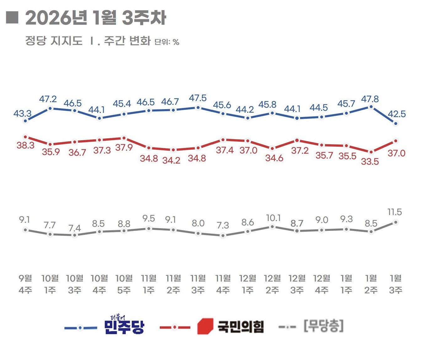 민주당 지지율은 전주 대비 5.3%포인트 하락했고, 국민의힘은 3.5%포인트 상승했다. 양당 격차가 14.3%포인트에서 5.5%포인트로 줄어들며, 지난해 9월4주차 이후 약 4개월만에 오차범위 안으로 좁혀졌다.