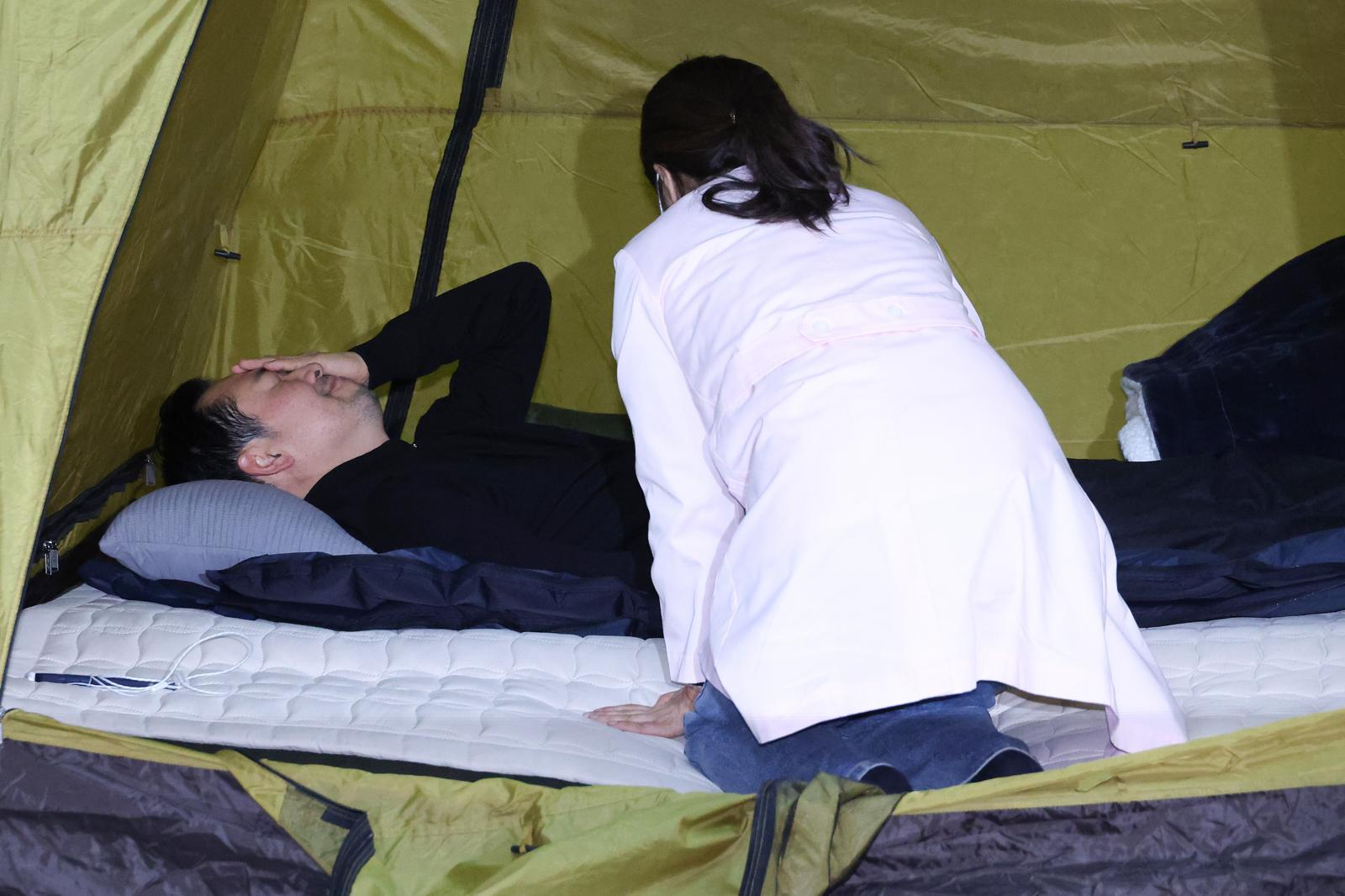 장동혁 국민의힘 대표가 20일 서울 여의도 국회 로텐더홀에 마련된 단식 농성장에서 건강 상태를 확인하고 있다. 2026.1.20 뉴스1