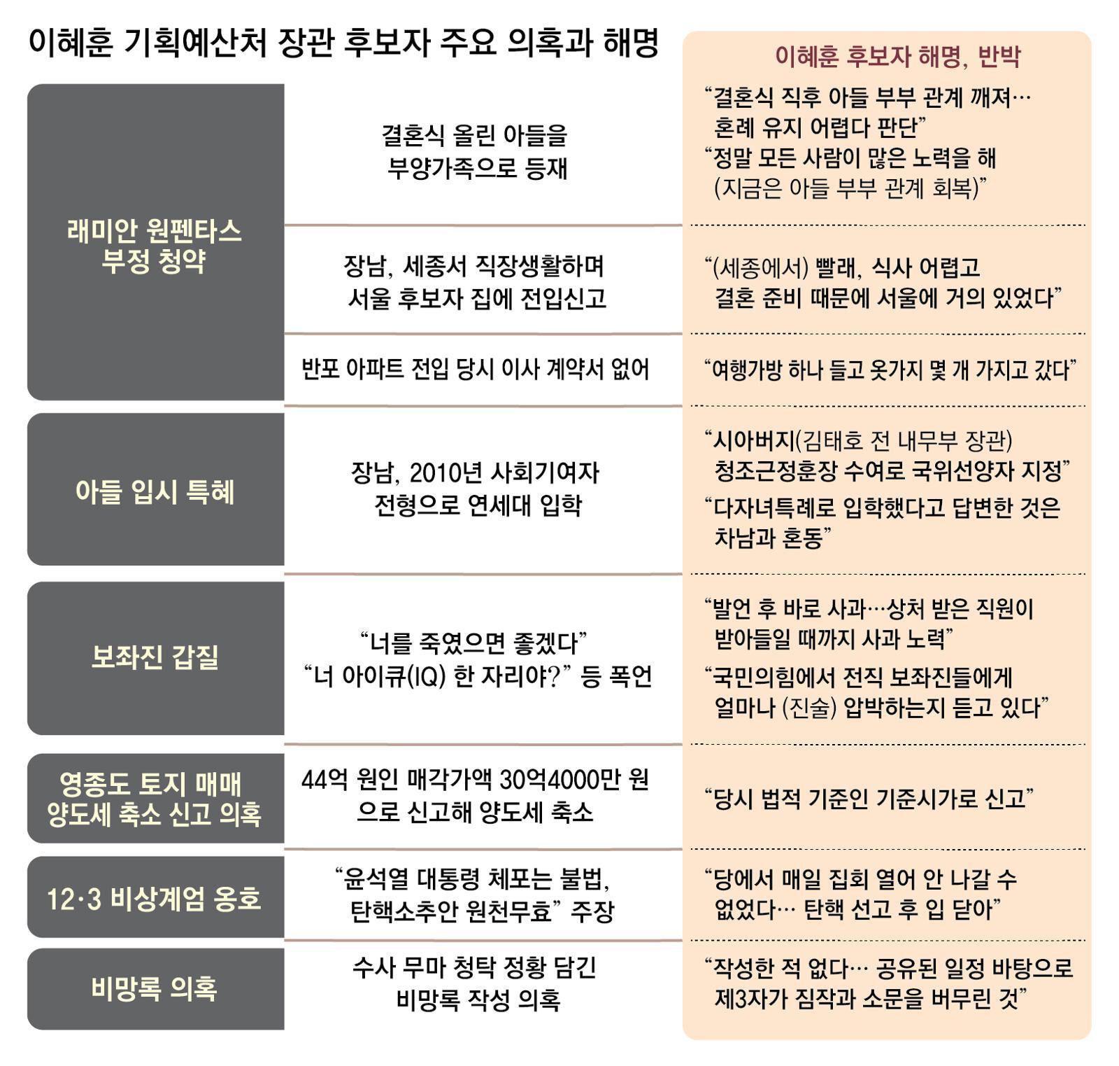 이혜훈 기획예산처 장관 후보자가 23일 국회 인사청문회에서 서울 서초구 원펜타스 아파트 부정 청약 의혹에 대해 “당시 장남 부부의 관계가 깨어진 상황이라 함께 살 수밖에 없는 상황이었다”고 말했다. 결혼식을 올린 장남을 부양가족으로 등록해 ‘로또 청약’에 당첨됐다는 이른바 ‘위장 미혼’ 의혹을 부인한 것. 하지만 장남이 이 후보자와 함께 살았다는 것을 증명할 자료는 내지 않으면서 의혹만 키운 청문회가 됐다는 지적이 나왔다.