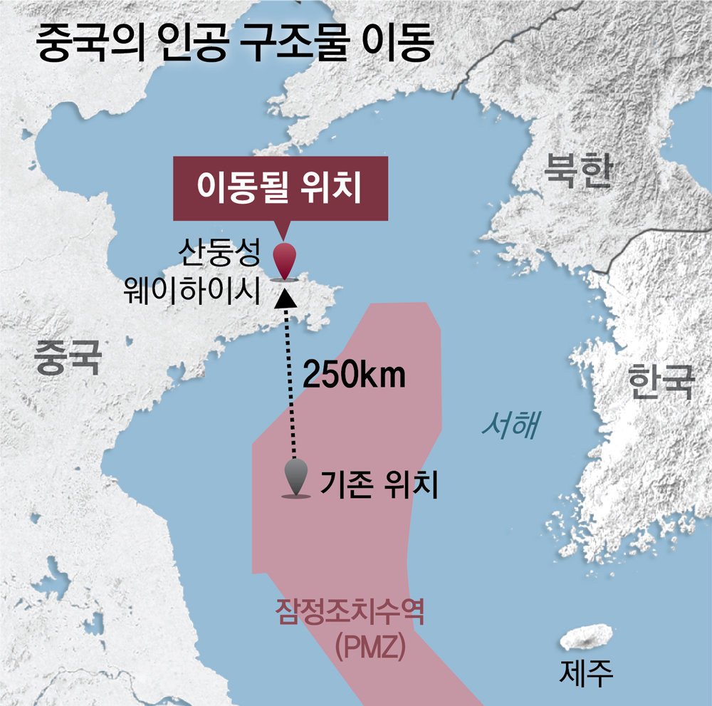 중국 해사국은 이날 오후 7시(현지 시간)부터 31일 밤 12시까지 이동 작업을 진행한다는 안전 공지를 전날 내놨다. 해사국 발표에 따르면 중국이 양식장 관리 플랫폼이라고 주장해 온 구조물은 직선거리로 약 250km 북쪽으로 이동하는 것으로 나타났다. 한국 외교부 당국자는 “(해당 구조물이) 논란이 되는 잠정조치수역에서 나가는 것까지 확인했다”고 설명했다.