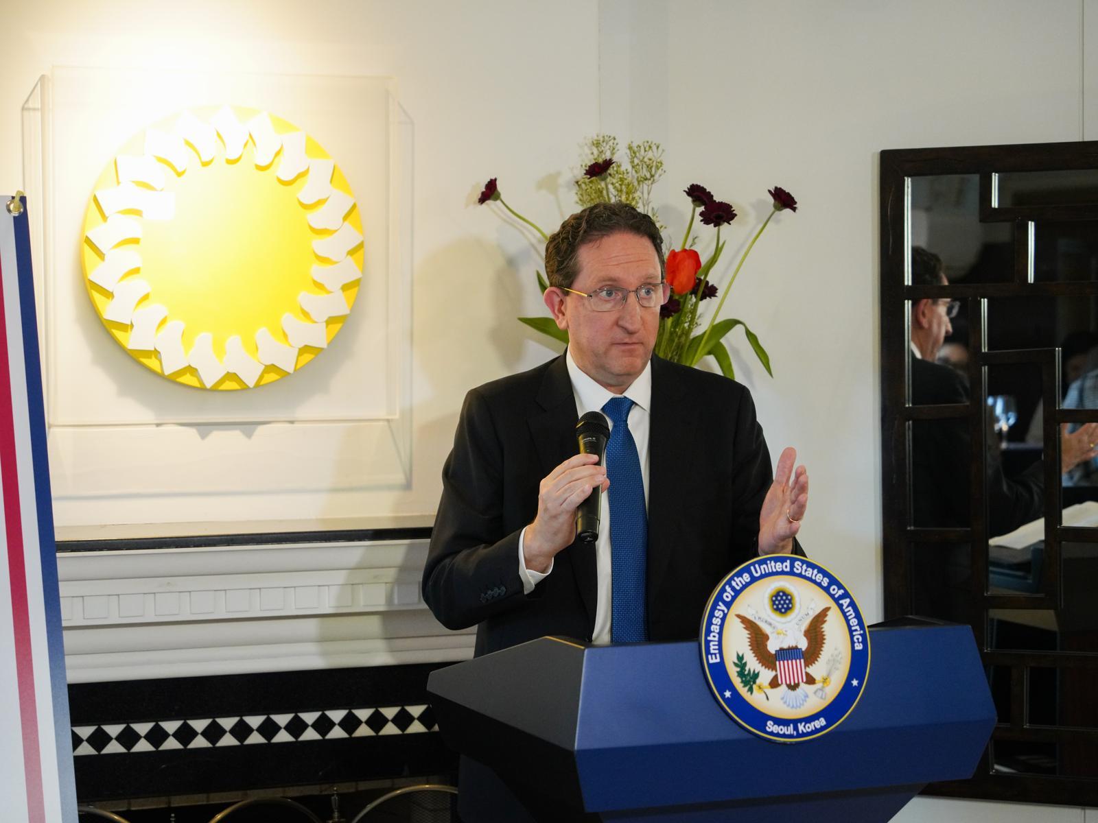 제임스 헬러 주한미국대사대리가 28일 서울 성북구 대사대리관저에서 열린 ‘표현의 자유: Freedom250 한미 창의 대화’ 행사에서 연설하고 있다. 주한미국대사관 제공