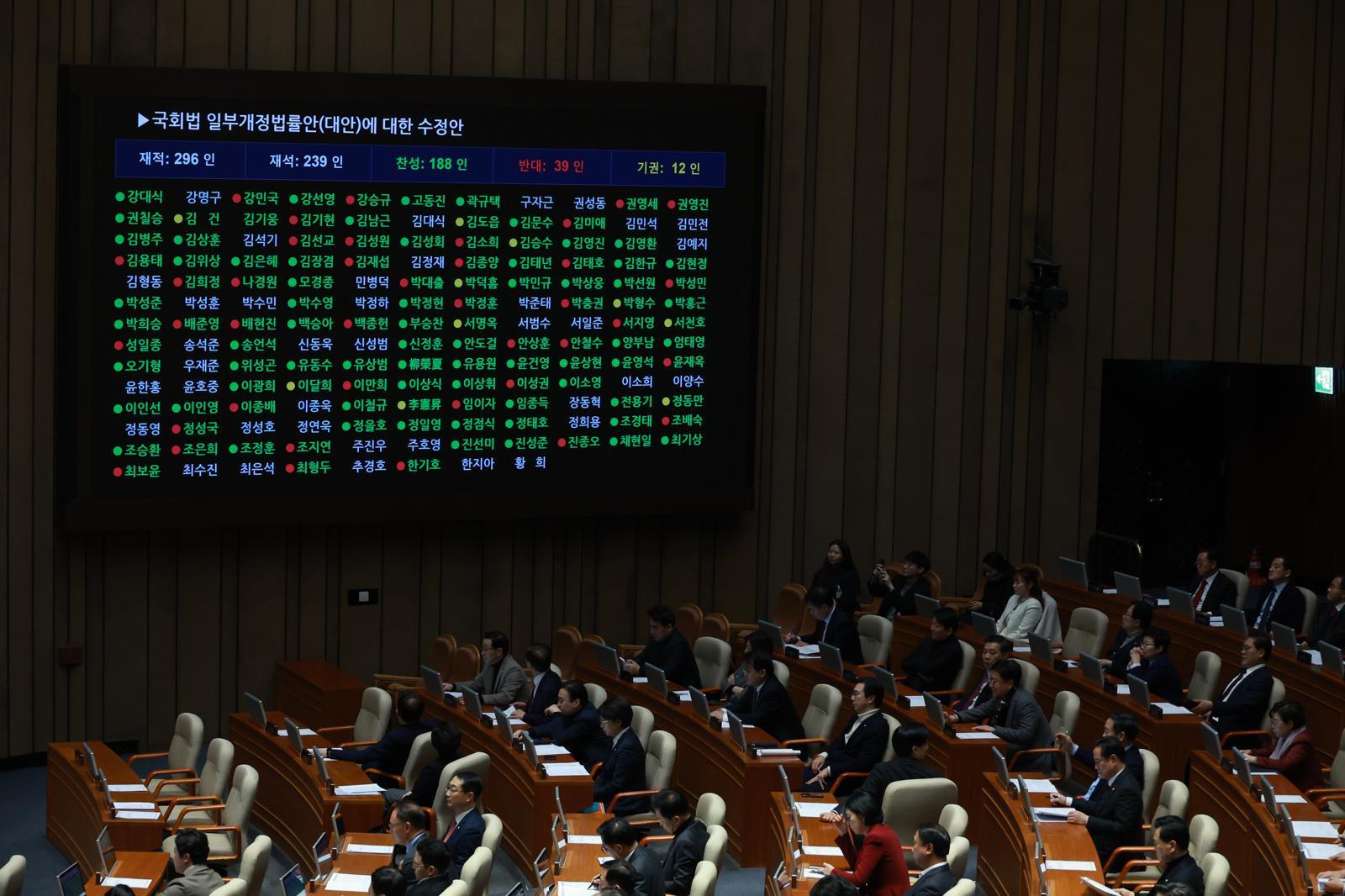 여야는 이날 본회의를 열고 국회법 일부개정법률안(대안)을 표결에 부친 결과 법안은 찬성 188명, 반대 39명, 기권 12명으로 가결됐다.