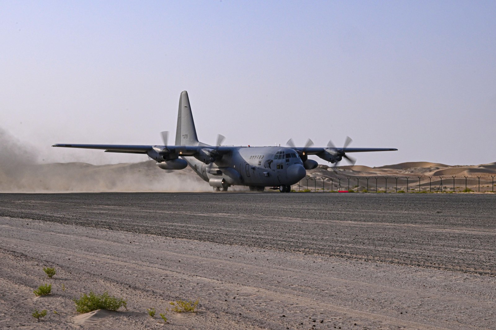 공군은 지난 21일부터(현지 시간) UAE 알 다프라 공군기지에서 열리는 ‘2025 데저트 플래그’에 참가해 화물 투하, 비포장 활주로 착륙 훈련 등을 실시하고 있다. 24일에는 UAE군사훈련협력단(아크부대)과 처음으로 합동고공강하 훈련도 실시했다. 사진은 비포장 활주로에 착륙하고 있는 C-130H. (사진=공군 제공) 2025.04.25. [서울=뉴시스]