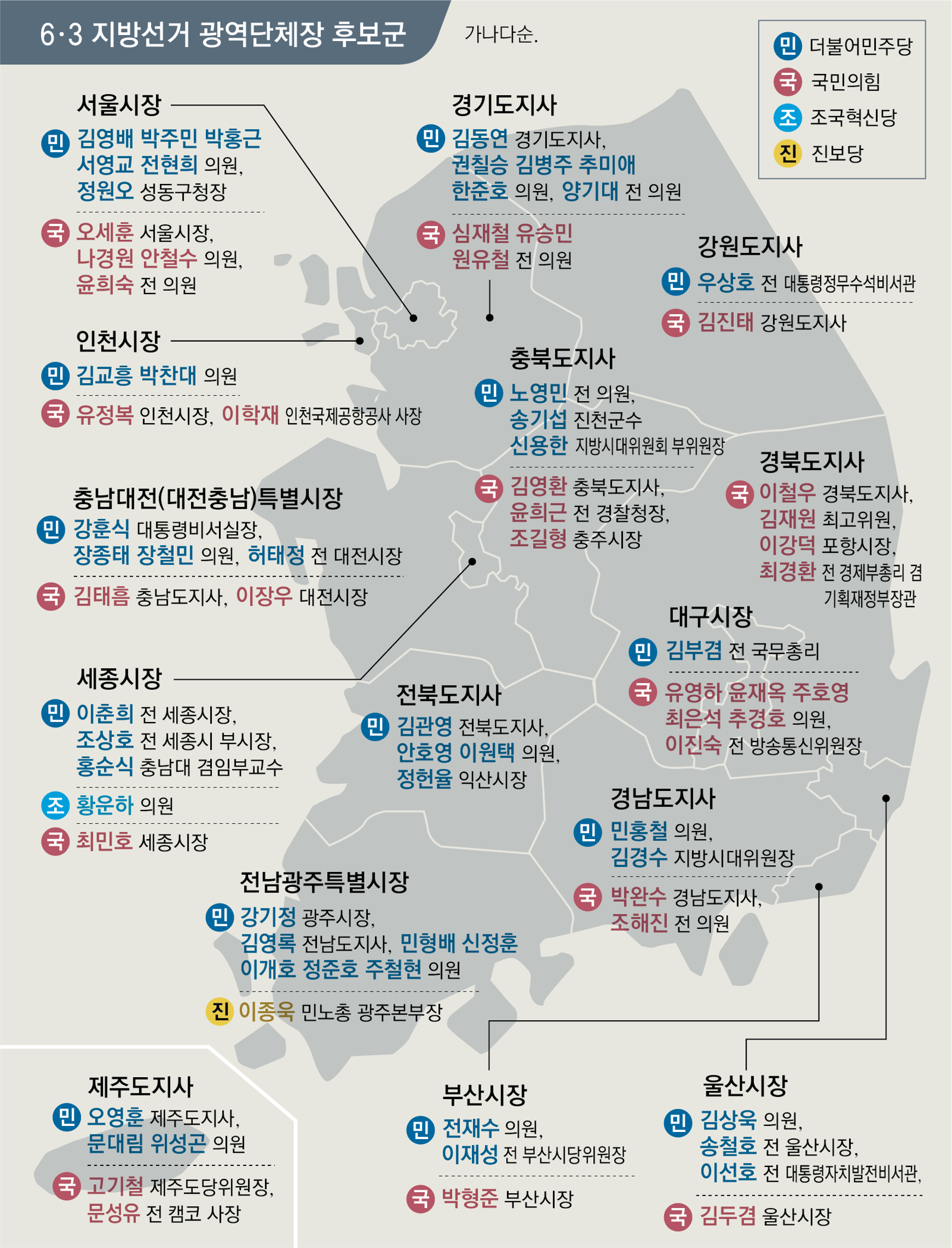 3일로 6·3 지방선거가 120일 앞으로 다가오면서 여야 광역단체장 후보자들의 윤곽이 드러나고 있다. 더불어민주당에서는 높은 국정 지지율을 등에 업고 서울과 경기 등에서 후보들의 출마 러시가 이어지면서 경선이 본선보다 더 치열할 것이라는 관측이 나온다. 내란 청산 여파와 내홍으로 지지율이 지지부진한 국민의힘은 2022년 지방선거에서 차지했던 서울과 부산 등 12곳을 지키는 데 총력전을 펼 전망이다.