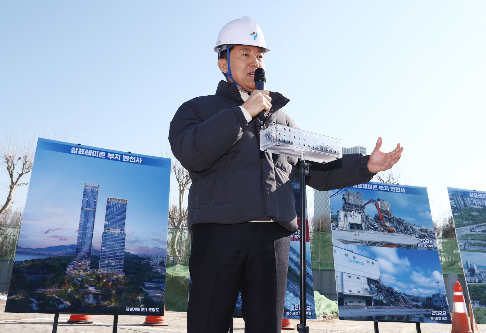 오세훈 서울시장이 3일 오전 서울 성동구 삼표레미콘 부지 사업 현장을 찾아 추진현황을 점검한 뒤 발언하고 있다. 한편 이날 서울시는 성수동1가 683번지 ‘서울숲 일대 지구단위계획구역 및 삼표레미콘 특별계획구역 세부개발계획’을 오는 5일 결정 고시한다고 밝혔다. 2026.2.3/뉴스1