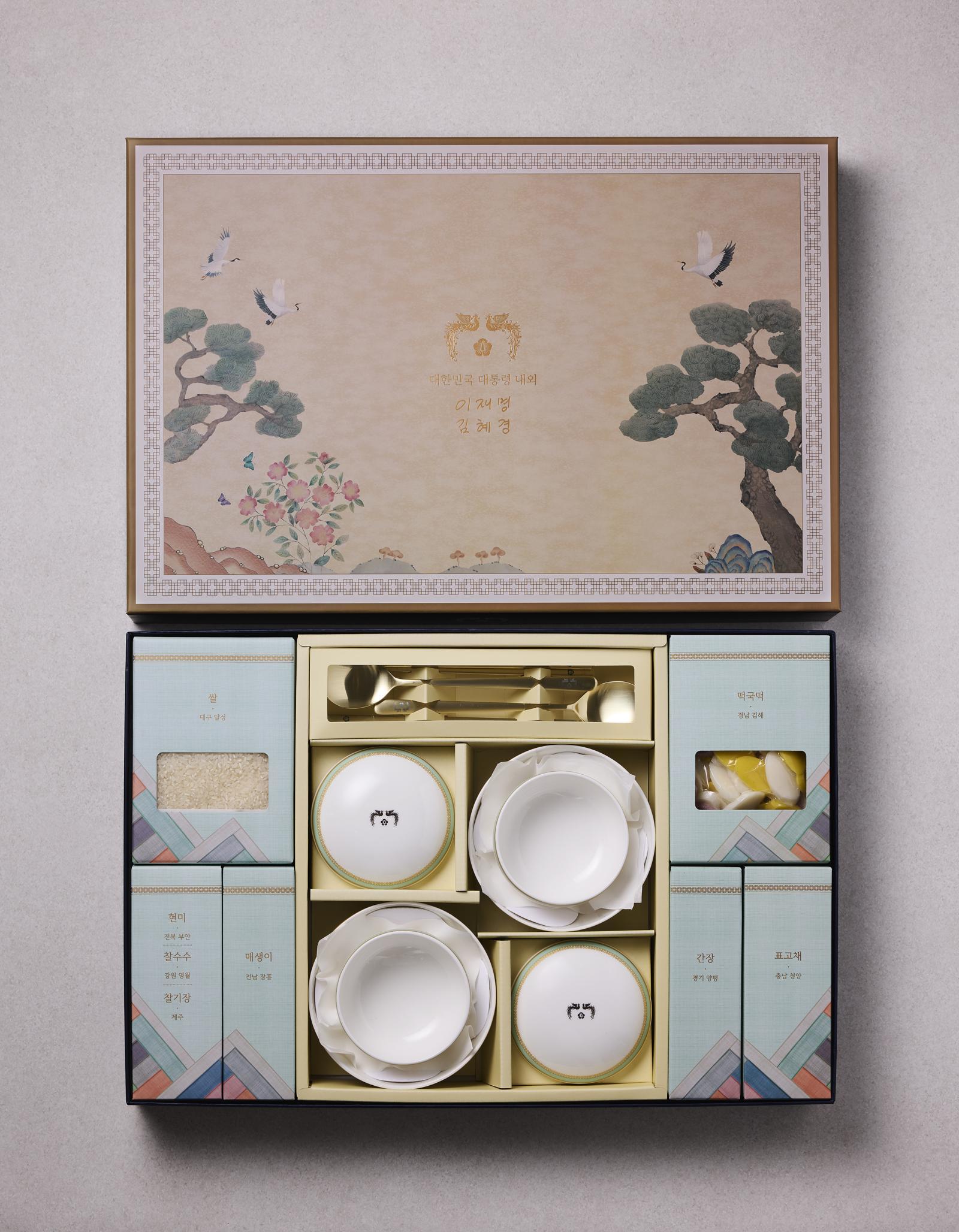 선물은 그릇·수저 세트와 집밥 재료로 구성됐다. 집밥 재료는 ‘5극(수도권, 충청권, 동남권, 대경권, 호남권) 3특(전북, 강원, 제주)’에서 생산된 쌀과 잡곡(현미, 찰수수, 찰기장), 떡국떡, 매생이, 표고채, 전통 간장 등으로 구성됐다. 청와대는 “특별 제작된 그릇·수저 세트에는 편안한 집밥이 일상이 되고, 소박하지만 따뜻한 한 끼가 국민 모두의 삶에 평온과 위로가 되길 바라는 대통령의 의지를 담았다”며 “집밥 재료는 5극 3특 권역의 특색을 반영하고 지역 균형 발전과 지역 간 상생·통합의 의미를 담았다”고 설명했다. 이 대통령은 취임 첫 명절인 지난해 추석에는 팔도 수산물과 우리 쌀을 선물한 바 있다.