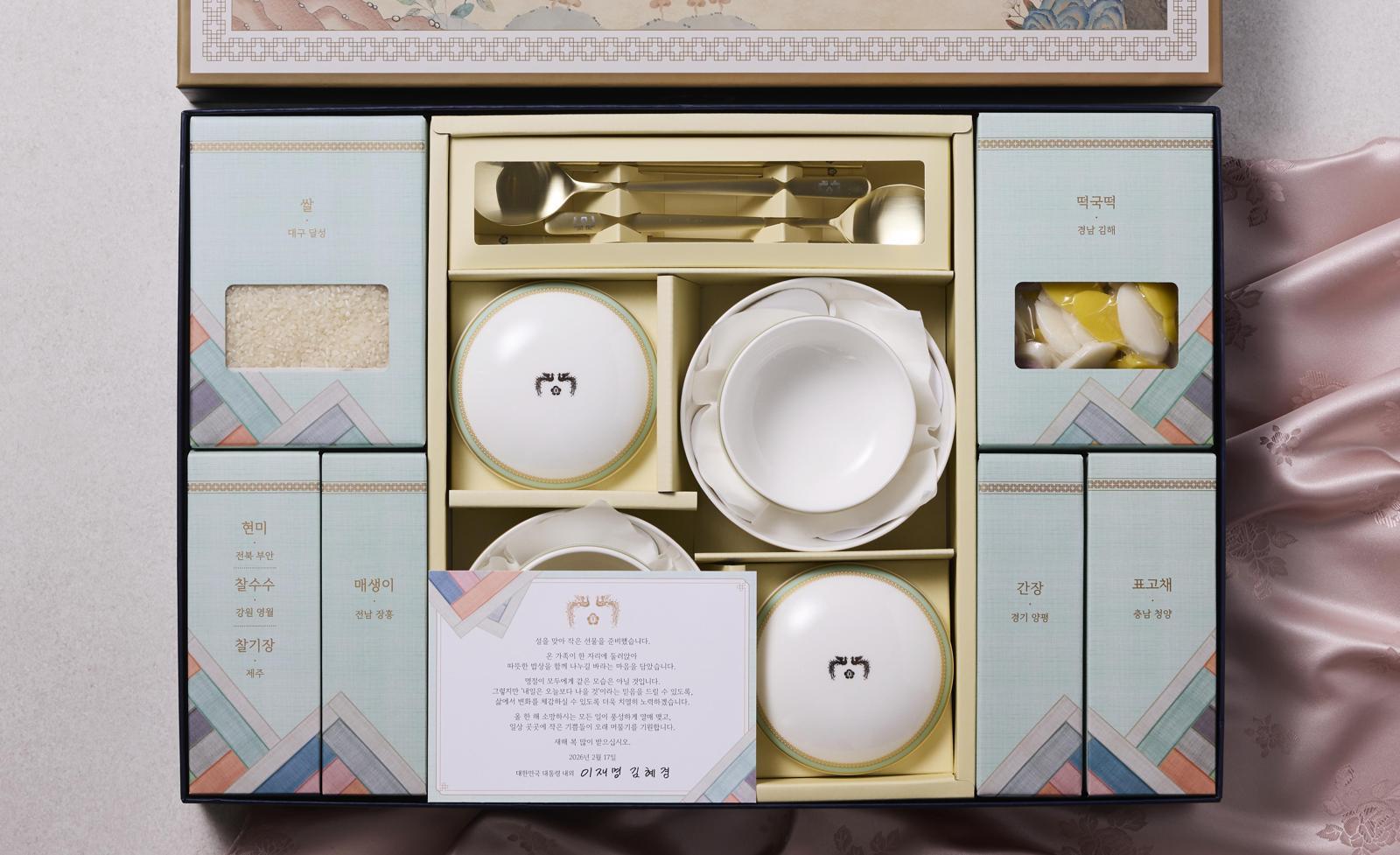 선물은 그릇·수저 세트와 집밥 재료로 구성됐다. 집밥 재료는 ‘5극(수도권, 충청권, 동남권, 대경권, 호남권) 3특(전북, 강원, 제주)’에서 생산된 쌀과 잡곡(현미, 찰수수, 찰기장), 떡국떡, 매생이, 표고채, 전통 간장 등으로 구성됐다. 청와대는 “특별 제작된 그릇·수저 세트에는 편안한 집밥이 일상이 되고, 소박하지만 따뜻한 한 끼가 국민 모두의 삶에 평온과 위로가 되길 바라는 대통령의 의지를 담았다”고 설명했다.