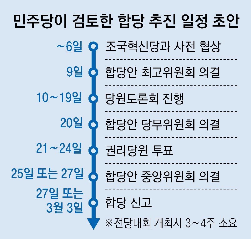 5일 동아일보가 입수한 민주당의 ‘합당 절차 및 추진 일정 검토(안)’ 문건에 따르면 2월 27일 또는 3월 3일 합당 신고를 마치는 내용의 합당 추진 일정이 담겼다. 이 문건은 당 사무처가 자체 작성한 대외비 문건이다. 문건에는 민주당과 조국혁신당이 2명씩 ‘2+2 사전실무협의체’를 가동해 열흘간 사전 협상을 마치고 합당 합의문을 발표하는 계획이 담겼다.