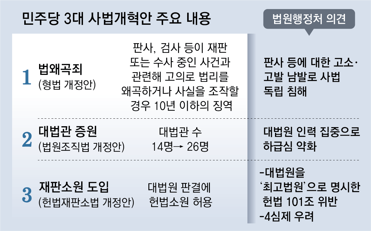 이날 법사위에서 의결된 법원조직법 개정안은 현재 14명인 대법관 수를 26명으로 늘리는 내용을 담고 있다. 민주당은 사건 적체 해소와 대법원 구성의 다양화 등 긍정적인 효과를 낼 것이라고 강조하고 있지만 법원행정처는 “대법원 인력 집중으로 하급심 약화가 우려된다”는 반대 의견을 냈다. 국민의힘 등 야권에서도 “대법원 구성을 여권 친화적 인사들로 채우려는 전형적인 ‘사법부 코드화’ 시도”라며 비판의 수위를 높이고 있다. 법관이나 검사가 고의로 법리를 왜곡하거나 사실을 조작할 경우 형사 처벌할 수 있도록 하는 법왜곡죄는 이보다 앞서 법사위를 통과해 본회의 처리를 앞두고 있다.