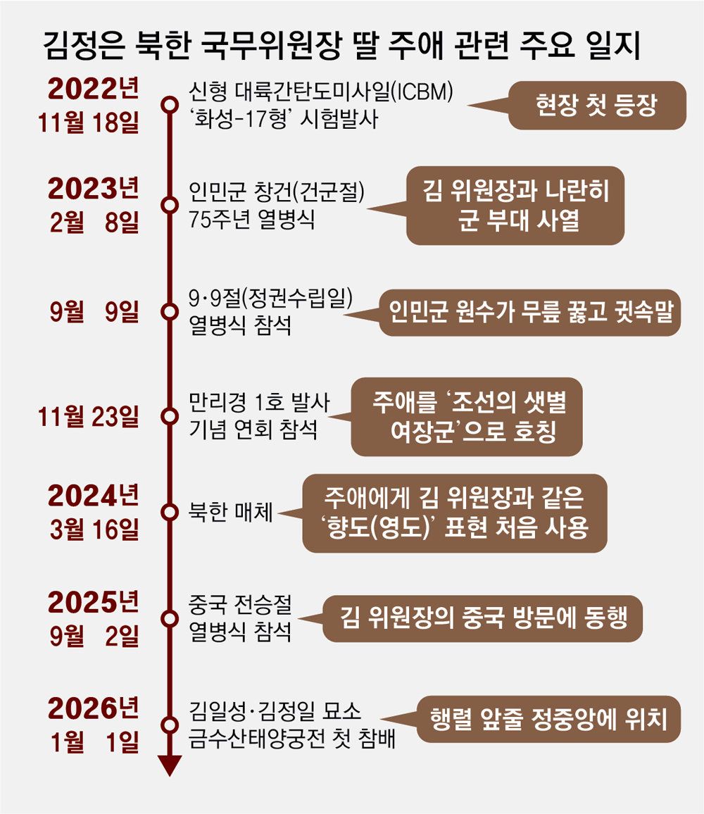 2024년 이후엔 북한 매체가 주애에게 김 위원장과 같은 ‘향도’(영도) 표현을 사용하고, 주애가 공식 행사에서 사실상 의전 서열 2위에 준하는 위치에 서는 장면이 반복됐다. 특히 지난해 9월 김 위원장의 중국 방문에 주애가 동행한 것이 확인되면서 주애의 후계자설에 힘이 실렸다. 주애는 올해 1월 새해 첫날 김일성 주석과 김정일 국방위원장의 시신이 안치된 금수산태양궁전을 처음 공개 참배하며 행렬 정중앙에 섰다.