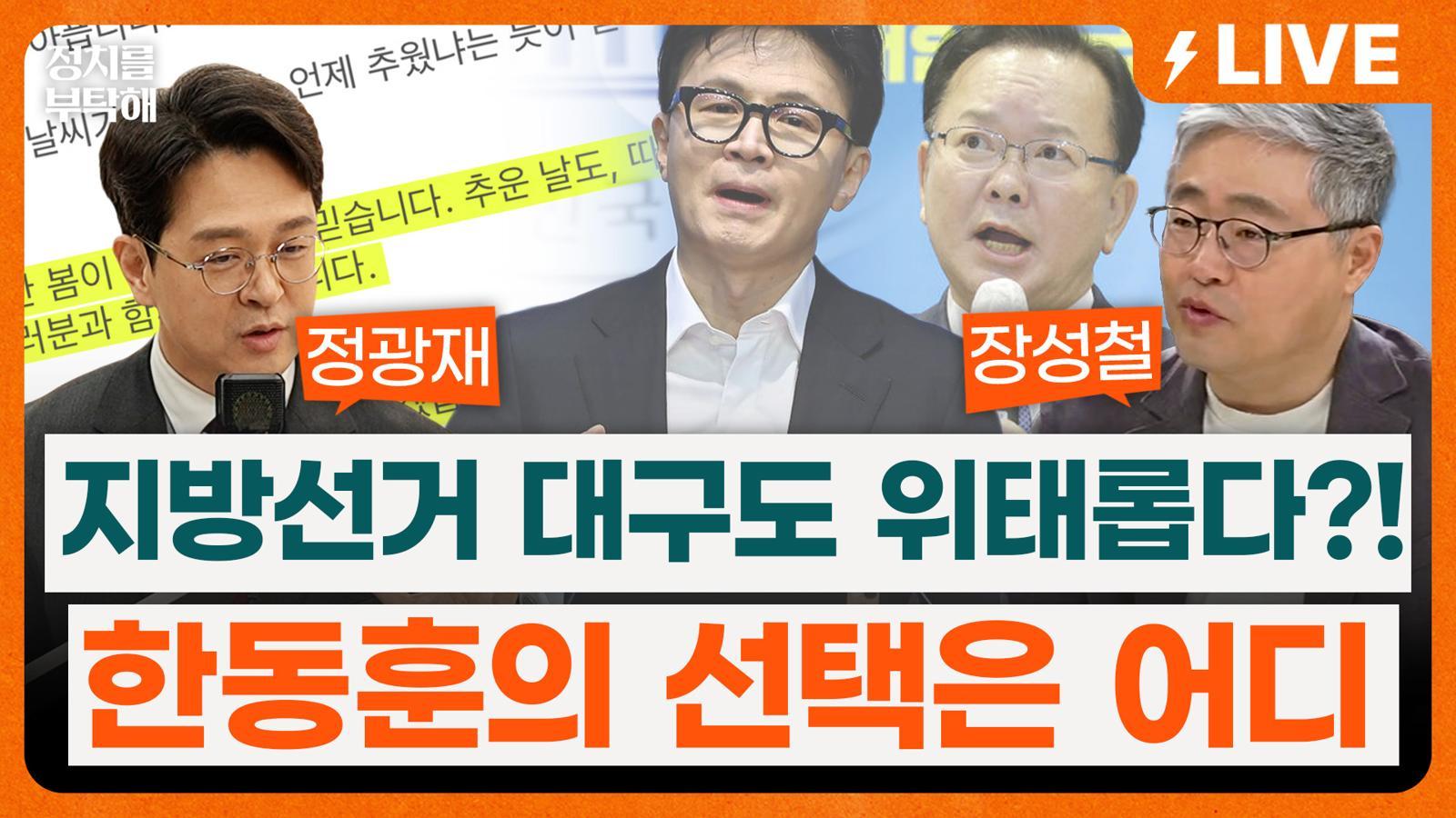 ▶ 장성철: 대구나 부산이나 이렇게 당선될 만한 곳에 가야죠. 많은 분들이 어떻게 한동훈까지도 대구에 갈 생각을 하냐 막 이렇게 얘기를 하고 있는데 일단은 정치권에서는 배지 안 달면 사람 취급을 못 받고 있기 때문에 일단은 사람이 되기 위해서라도 일단은 배지를 달아야 된다. 그런데 본인도 말씀 잘하신 것 같이 본인도 어떻게 해야 될지 모를 거예요. 왜냐하면 뭐 선택지가 있어야 선택을 하지 선택지가 지금 없는데 만약에 만약을 이렇게 얘기하는 것은 적절하지 않은 것 같아요.