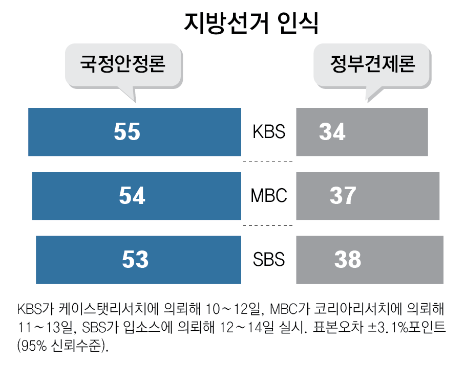 18일 지상파 3사 여론조사를 분석한 결과 이번 지선과 관련해 ‘정부의 국정 안정을 위해 여당에 힘을 실어줘야 한다’는 국정안정론 응답이 ‘정부를 견제하기 위해 야당에 힘을 실어줘야 한다’는 정부견제론 응답에 비해 15∼21%포인트 높았다. 국정안정론이 정부견제론에 비해 일관되게 오차범위(±3.1%포인트) 밖에서 우세를 보인 것이다.