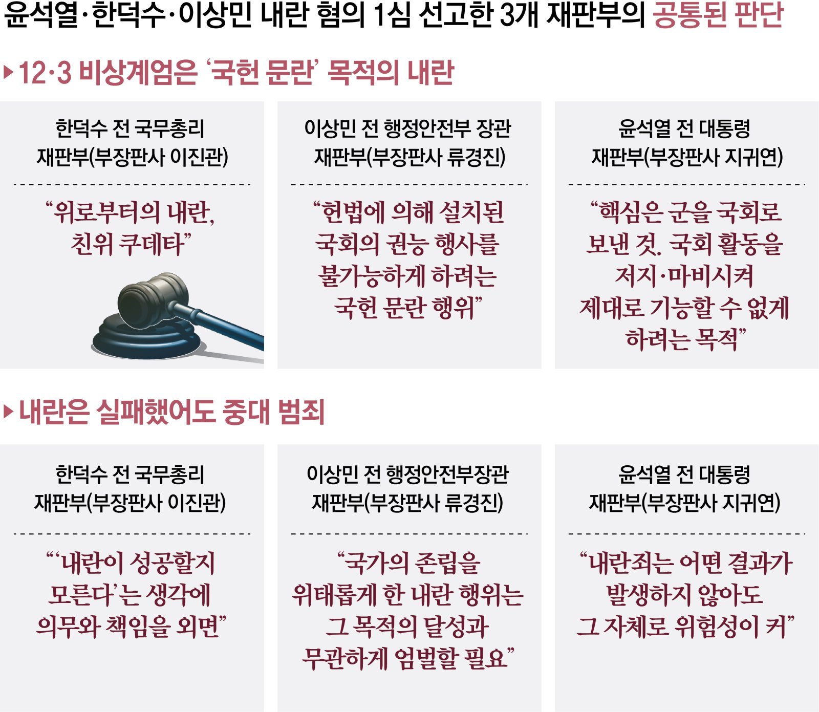 실패한 내란도 엄중하게 처벌해야 한다는 법리도 세 재판부가 같았다. 이 전 장관 재판부는 “목적 달성 여부와 무관하게 엄중한 처벌이 필요하다”고 했고, 윤 전 대통령 재판부도 “내란죄는 어떤 결과가 발생하지 않아도 그 자체로 위험성이 크다”고 설명했다.