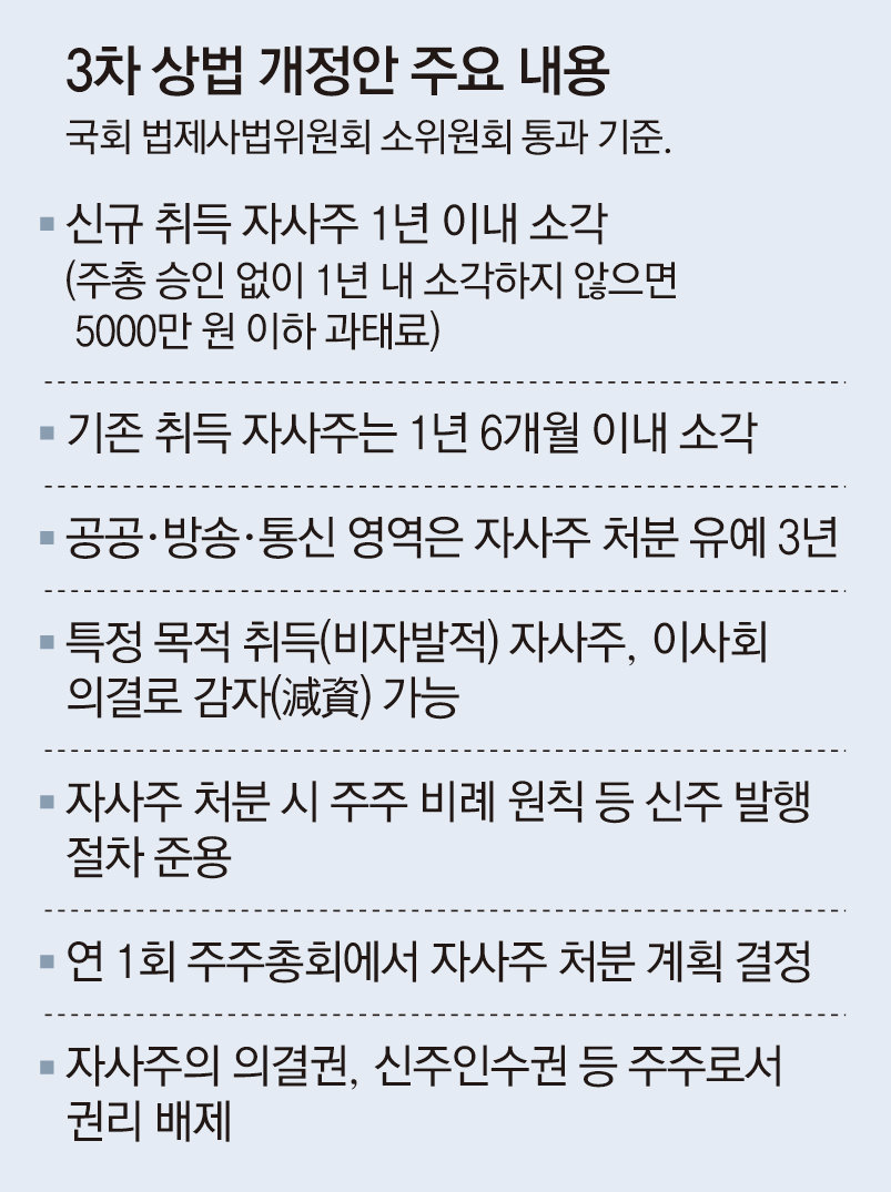 재계가 요청했던 다른 사안인 중소·벤처기업과 스타트업 등의 자사주 소각 의무 예외 역시 허용되지 않았다. 중소기업이 자사주 보유를 통해 경영권 보호에 나서는 현실을 반영해 달라는 요청이었지만 반영되지 않았다. 다만 통신업종 등 국가 안보 차원에서 외국인 지분 제한이 있는 기업의 자사주에 대해선 ‘3년 내 처분’으로 예외 규정을 뒀다.