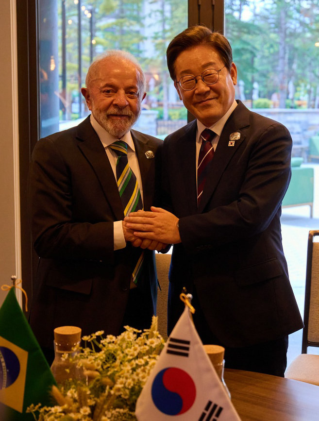 이재명 대통령이 17일(현지 시간) 캐나다 앨버타주 카나나스키스 주요 7개국(G7) 정상회의장에서 루이스 이나시우 룰라 다 시우바 브라질 대통령과 한-브라질 정상회담에 기념촬영하고 있다. 2025.06.18 사진공동취재