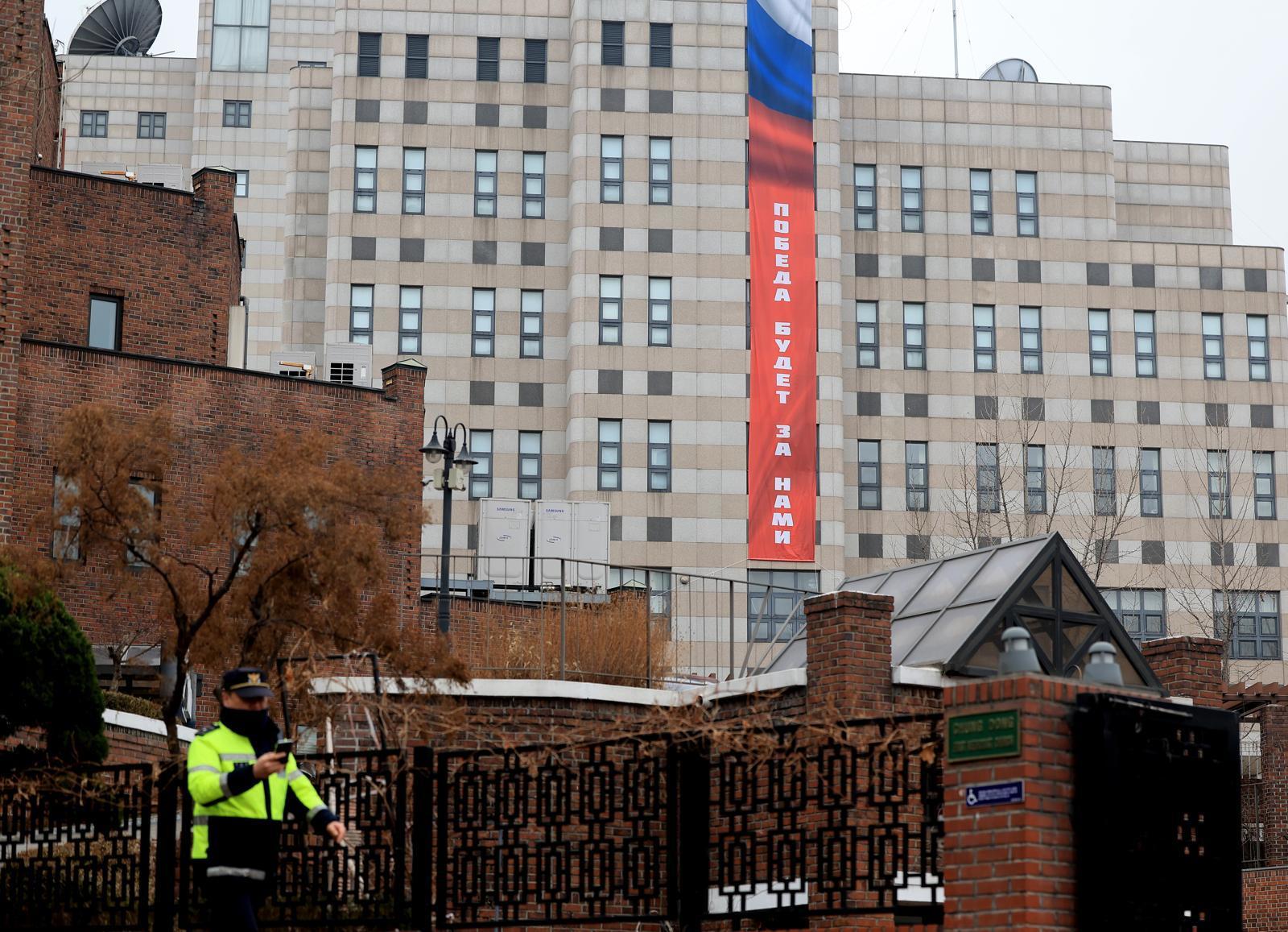 러시아 대사관은 23일 공관 건물 배너 게시와 관련한 입장문을 내고 “대사관 구역 내 배너나 현수막 등 각종 홍보물을 게시하는 것은 일반적인 관행”이라고 밝혔다.