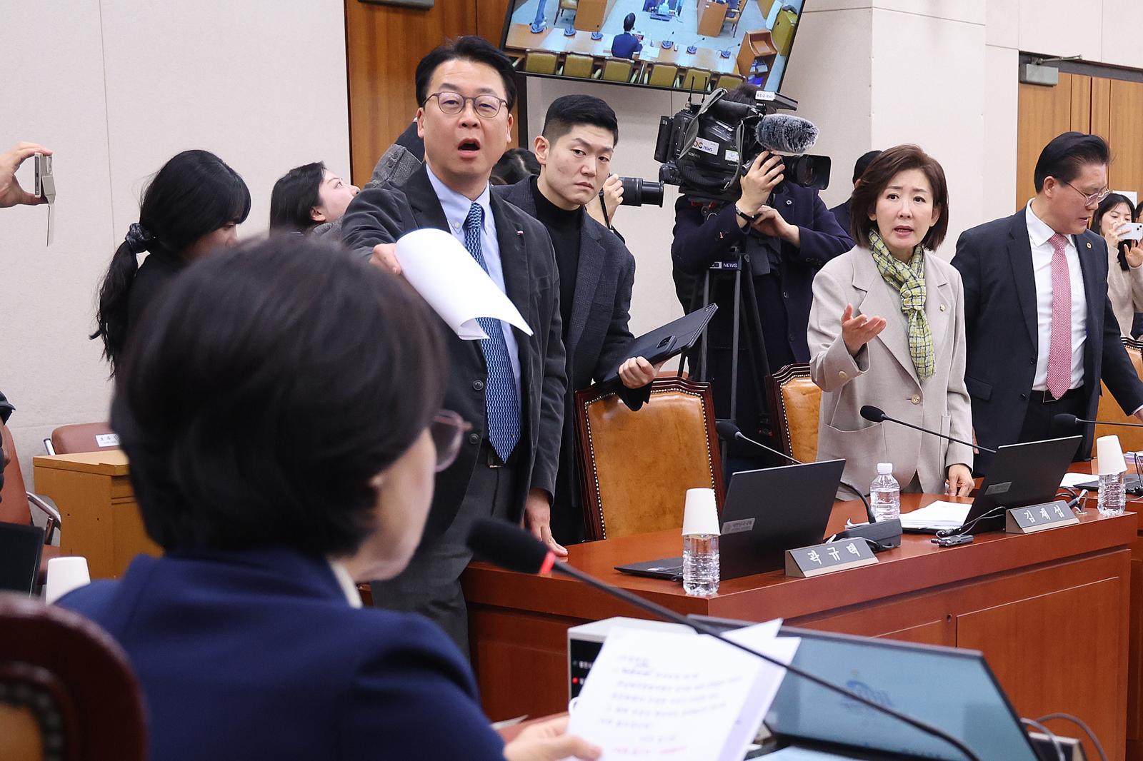 나경원 국민의힘 의원이 24일 오전 서울 여의도 국회에서 열린 법제사법위원회 전체회의에서 추미애 법사위원장에게 의사진행 발언을 신청하고 있다. 뉴시스 이에 민주당 장경태 의원은 “사실상 행정 통합에 대한 논의는 윤석열 정권과 국민의힘에서 더 적극적으로 추진했던 사안”이라고 반박했다.