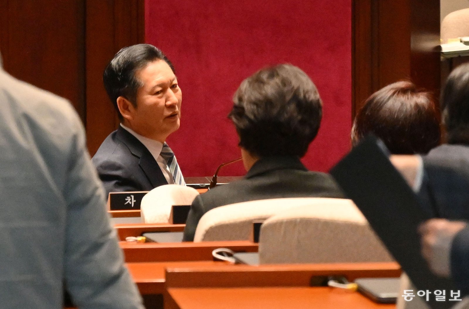 더불어민주당 정청래 대표와 동료 의원들이 25일 국회에서 열린 비공개 의원총회에서 대화하고 있다. 이훈구 기자 ufo@donga.com