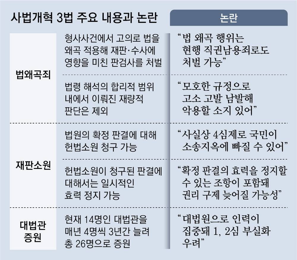 법왜곡죄를 신설하는 형법 개정안이 더불어민주당 주도로 26일 국회 본회의를 통과한 가운데 법원과 검찰 안팎에서는 “이미 직권남용으로 충분히 처벌할 수 있는 범죄를 이름만 새로 단 쓸모없는 법안”이라며 “법관과 검사의 독립적인 업무 수행을 옥죄기만 할 것”이라는 지적이 쏟아졌다. 민주사회를 위한 변호사모임(민변), 참여연대 등 진보 성향 시민단체에서도 우려의 목소리가 나왔다.