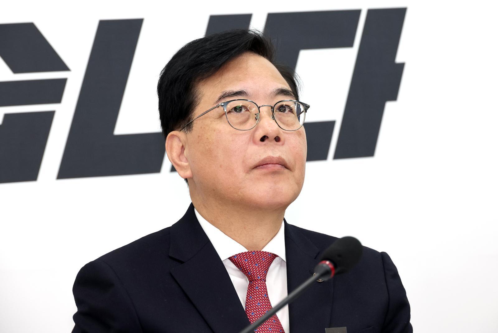 송언석 국민의힘 원내대표가 27일 오전 서울 여의도 국회에서 열린 기자간담회에서 생각에 잠겨 있다. 뉴시스
