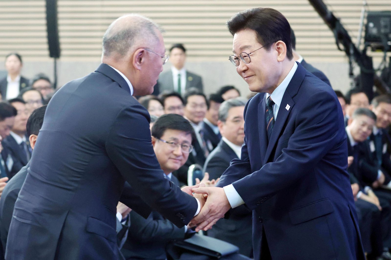 이재명 대통령이 현대자동차그룹의 전북 새만금 지역에 대한 9조 원 투자를 언급하며 정의선 현대차 회장을 향해 “정주영 회장님이 자랑스러워하실 것”이라고 반겼다. 이 대통령은 축사 도중 객석에서 박수가 나오자 “우리 정의선 현대자동차그룹 회장님한테 하는 환호냐”고 물은 뒤 “그게 맞다. 우선 감사의 박수 드리죠”라고도 했다.