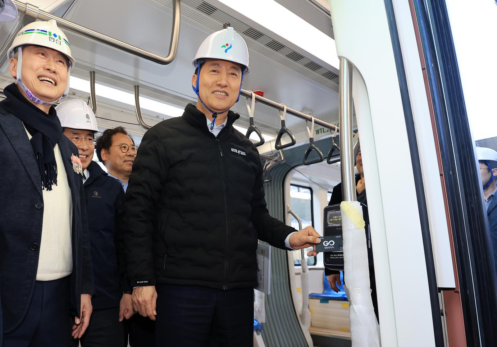 (서울=뉴스1) 오세훈 서울시장이 27일 서울 송파구 위례선(트램)에 탑승해 교통카드를 찍고 있다. 2026.2.27/뉴스1