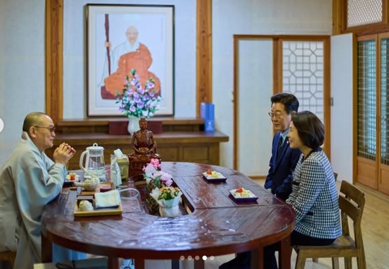 이 대통령이 SNS에 올린 사진을 보면 이 대통령 내외는 주지스님과 함께 사찰 경내를 거닐고 절을 방문한 불자들과 자유롭게 사진을 찍었다.
