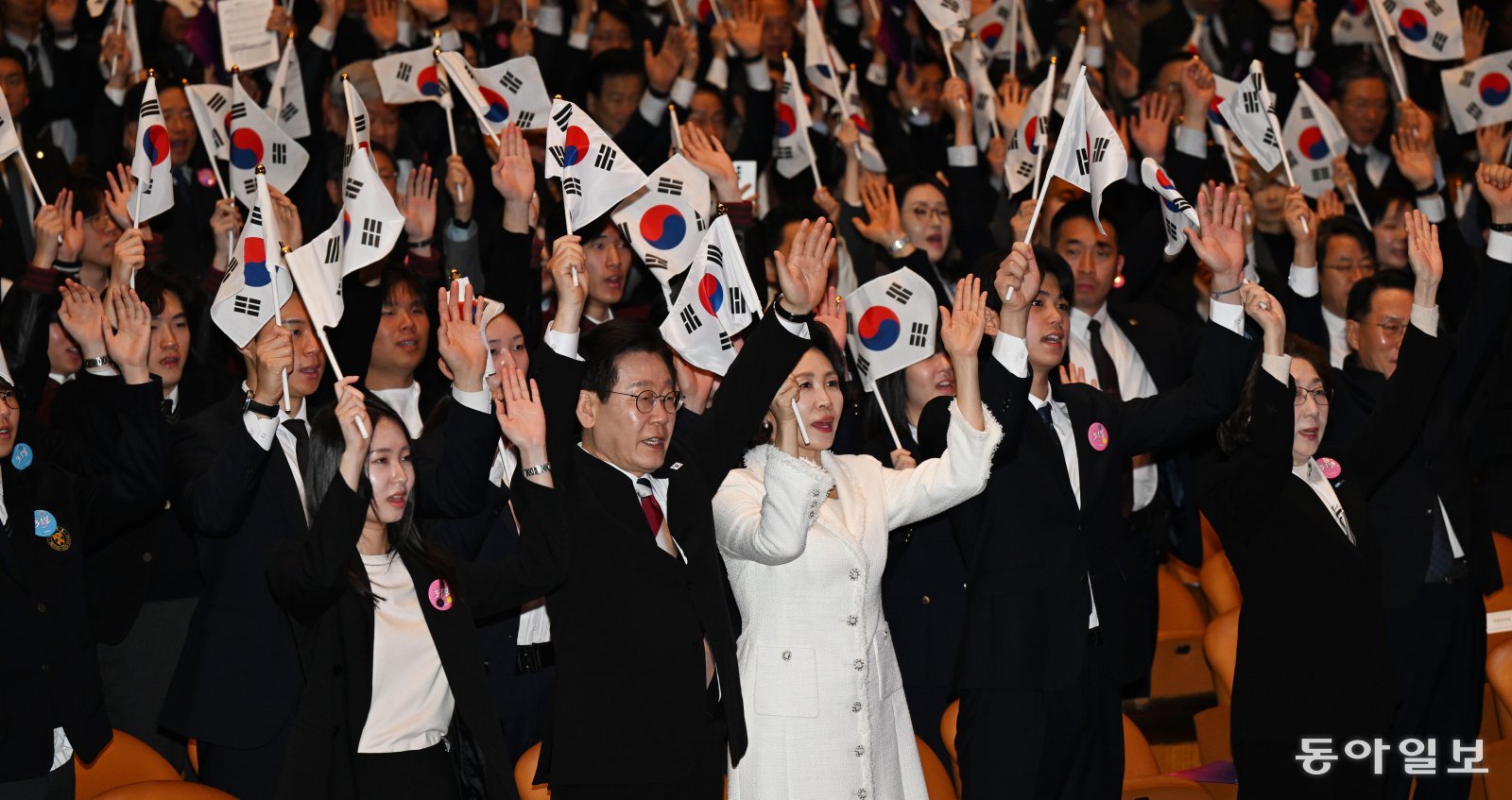 이재명 대통령과 김혜경 여사가 1일 오전 서울 강남구 코엑스에서 열린 제107주년 3·1절 기념식에서 만세삼창을 하고 있다. 이 대통령은 기념사에 “함께 성장하는 평화로운 한반도를 만드는 것이야말로 3·1혁명의 정신을 온전히 계승하는 길”이라며 “선열께서 간절하게 바랐던 평화와 공존의 꿈을 지금, 여기, 한반도에서부터 실현해 나가자”고 말했다. 송은석 기자 silverstone@donga.com