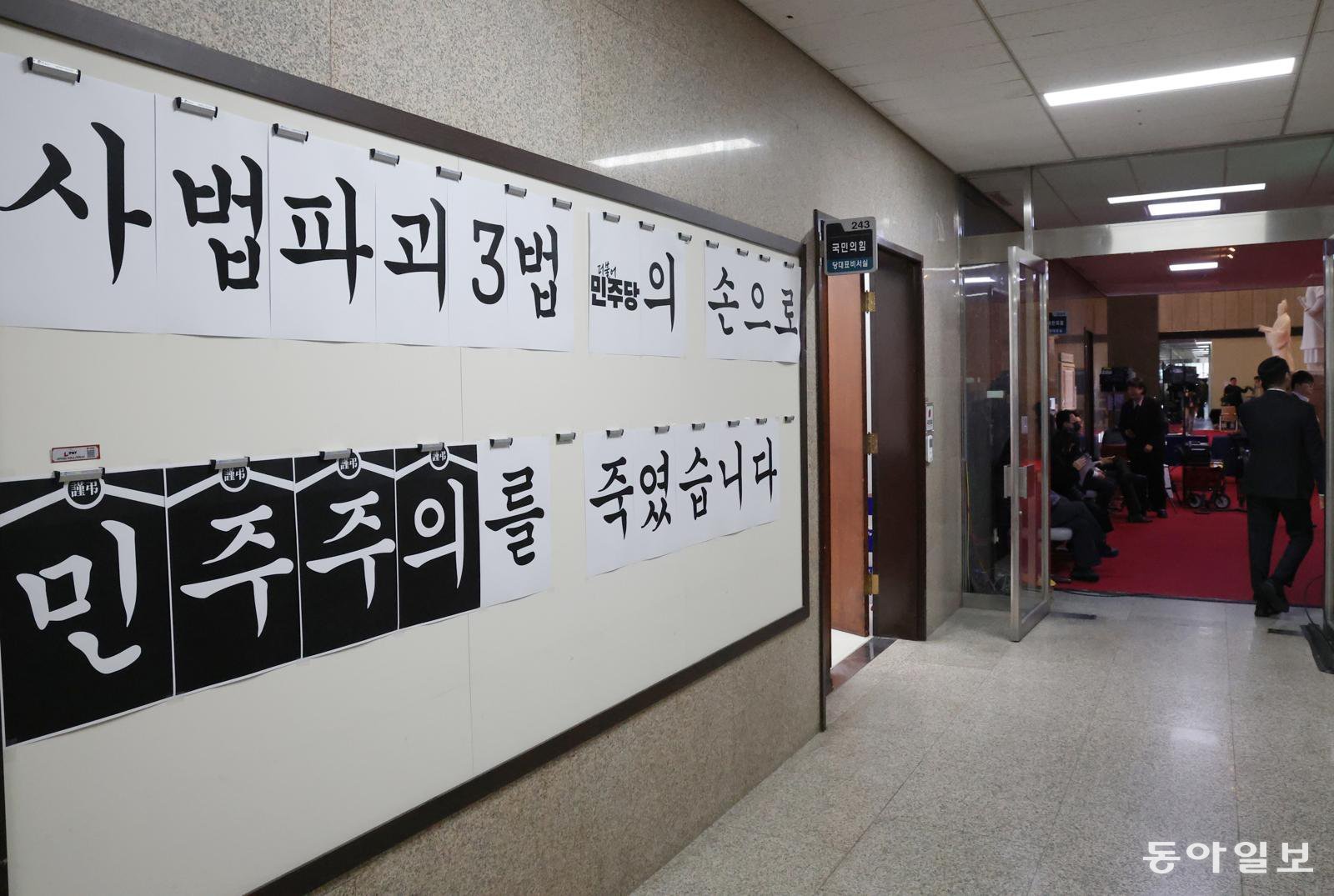 4일 오후 국회 국민의힘 당 대표실 앞 게시판. 더불어민주당의 입법 폭주를 비난하는 문구로 벽을 채웠습니다. 3일 여당의 사법개편 3법에 반발해 청와대까지 도보행진을 하는 장외투쟁까지 나섰으나 “처절한 투쟁이 ‘윤 어게인’ 당으로 전락했다”는 불만이 분출하는 상황입니다. 새로운 청년인재 영입과 다양한 공천방식을 내놓고 있지만, 국민들의 반응은 싸늘합니다. 반면 지방선거를 향한 더불어민주당의 발걸음은 빠릅니다. 지난달 27일에는 강원도지사로 우상호 전 의원을, 4일 오전엔 인천시장 후보에 박찬대 의원을 단수 공천으로 발표했습니다. 오후에는 전국의 시도당 공천관리위원장을 불러 압도적인 선거승리를 다짐했습니다.