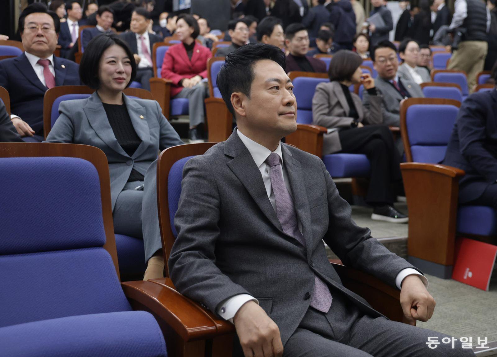 지난달 23일 서울 여의도 국회에서 열린 국민의힘 의원총회에 장동혁 대표와 배현진 의원이 참석해 송언석 원내대표 발언을 듣고 있다. 2026.02.23 박형기 기자 oneshot@donga.com