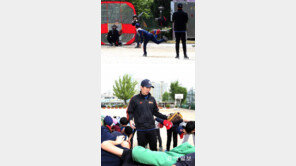 “후 렛 더 도그스 아웃∼.” “웁! 웁! 웁웁! 웁!” 23일 서울 영등포구 문래초등학교 운동장. 유격수를 맡고 있는 남학생이 그룹 바하 멘의 히트곡 ‘후 렛 더 도그스 아웃(Who Let the Dogs Out·누가 개들 풀어 놨어)’ 첫 소절을 부르자 다른 수비수들이 다음…