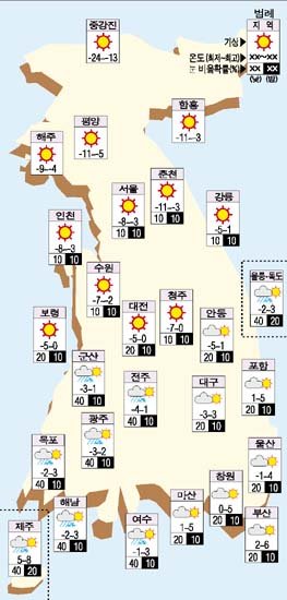 전국이 대체로 맑겠다. 아침최저기온은 영하12도∼영상3도, 낮최고는 영하2도∼영상8도.