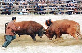 6일 경북 청도군 이서면 서원천변에서 열린 제9회 전국 민속투우대회에서 소 두마리가 뿔을 맞대고 힘을 겨루고 있다.<청도=최재호기자>