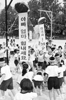 서울 한양대 운동장에서 27일 열린 한양초등학교 운동회에서 학생들이 터트린 박에서 IMF시대를 실감나게 하는 현수막들이 나와 눈길을 끌었다.