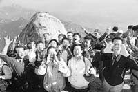 단풍이 곱게 물든 8일 북한산 백운대에 오른 등산객들이 ‘야호’를 외치며 정상 정복의 기쁨을 만끽하고 있다. 맑은 가을하늘 덕택으로 뒤편의 인수봉이 손에 닿을 듯 가깝게 보인다.