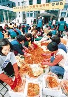 ‘사랑을 듬뿍 담은 김장김치’. 서울 중랑구청 새마을지도자와 부녀회원 2백40명이 24일 오전 중랑구청 광장에서 관내 실직자와 소년소녀 가장 및 혼자 사는 노인에게 전달할 5천포기의 김장김치를 담그고 있다.