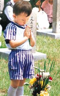 현충일을 이틀 앞둔 4일 서울 동작구 동작동 국립묘지를 찾은 유치원생들이 한 순국 장병의 묘지 앞에서 두손모아 묵념을 올리고 있다.<김동주기자>