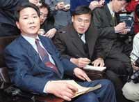 배정숙씨가 소위 '사직동 문건'을 전달해준 장본인으로 연정희씨를 지목하자 연씨의 변호인 임운희씨(왼쪽)가 22일 서울지검 기자실에 들러 이에 대한 입장을 밝히고 있다.〈신원건기자〉
