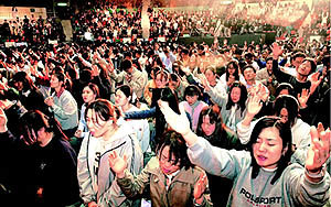 1만여명의 개신교 신자들이 부활절인 23일 오전 서울 장충체육관에서 '한국교회 부활절 연합예배'를 갖고 있다. 개신교계는 이날 전국 170개소에서 동시에 부활절 연합예배를 가졌으며 천주교계도 서울대교수 등 각 교구와 본당에서 부활대축일 특별 미사를 올렸다. 한편 북한 조선기독교연맹 관계자들도 이날 평양의 봉수교회 칠골교회에서 대희년민족통일선교대회본부 대표 총재인 신현균목사(서울 성민교회 원로목사)등 남한 종교인 8명과 함께 부활절 공동 예배를 가졌다.