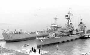 30일 충남 당진군 삽교호 관광지 해안에 도착한 퇴역 상륙작전함(왼쪽)과 구축함. 충남도와 당진군은 해군측으로부터 무상 대여한 이들 퇴역 전함을 활용해 내년 4월까지 '함상공원’을 조성할 계획이다.
