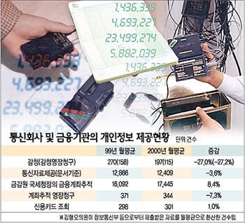 통신회사가 별도의 영장 없이 수사기관의 요청에 따라 전화가입자, 통화 시간, 통화한 상대방 전화번호 등 통신 자료를 제공한 사례는 지난해 월평균 1만2866건에서 올해 1만2409건으로 3.6% 감소했다.
