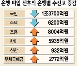 한편 조흥 한미 우체국예금 신한 농협 등은 수신고가 빠르게 늘어나 반사이익을 누린 것으로 밝혀졌다. 금감원 관계자는 “파업으로 인해 안정성이 높은 기관으로 자금이 몰리고 있다”면서 “특히 우체국예금은 은행권 구조조정 소용돌이가 몰아친 이달 들어 수신고가 7000억원 이상 증가했다”고 말했다.